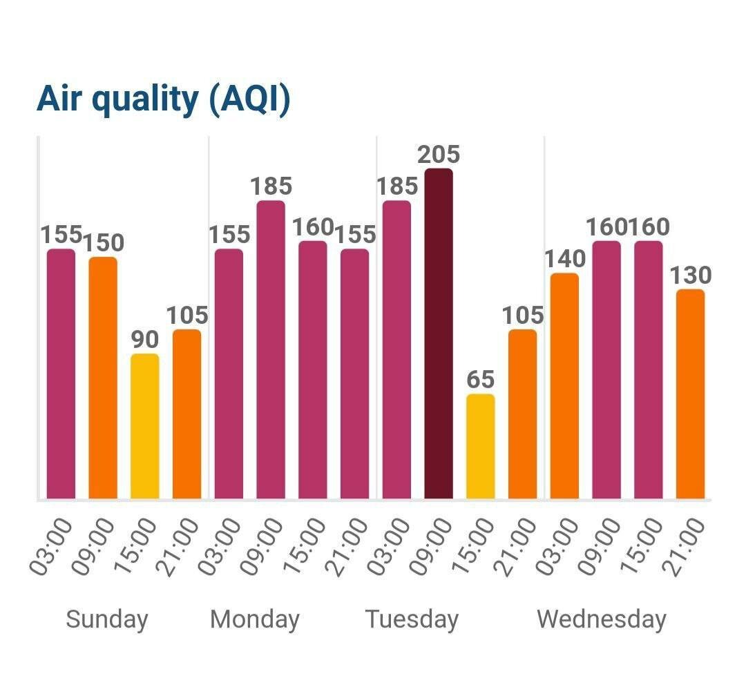 پیشبینیهای ماهوارهای نشان میدهد از ساعت ۳صبح دوشنبه تا ۹صبح سهشنبه شاخص کیفیت هوای پایتخت به بدترین شرایط سال اخیر میرسد و عدد از ۱۵۵ تا ۲۰۵ افزایش مییابد. به گزارش روزنامه اینترنتی فراز، البته از ظهر سهشنبه با ورود ناپایداریها، کیفیت هوا بهتر خواهد شد.