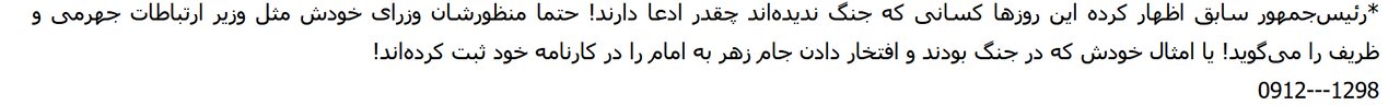 گفتنی است کیهان که چنین اتهامی را به حسن روحانی زده اعطای دو نشان فتح و ظفر از سوی رهبرمعظم انقلاب را سانسور کرده و علاوه بر آن روزنامه دولت به عنوان حامی کیهان از عدم حضور رئیسی در جبهه که در آغاز جنگ ۲۱ساله بوده چیزی ننوشته است. اضافه می شود که برادر بزرگتر جوادآذری جهرمی از شهدای دفاع مقدس است و جوادظریف نیز در ماموریت سازمان ملل بوده و سربازی خود را با توافق مسئولین وقت در آنجا سپری کرده و در زمان مذاکرات قطعنامه۵۹۸ عضو تیم دکتر ولایتی بوده است.