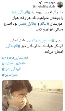 مهدی حساکره: مردم استان خوزستان طی پیام های متعدد به عدم تعطیلی استان در روزهای که آلودگی هوا در وضعیت قرمز است، اعتراض کرده اند.