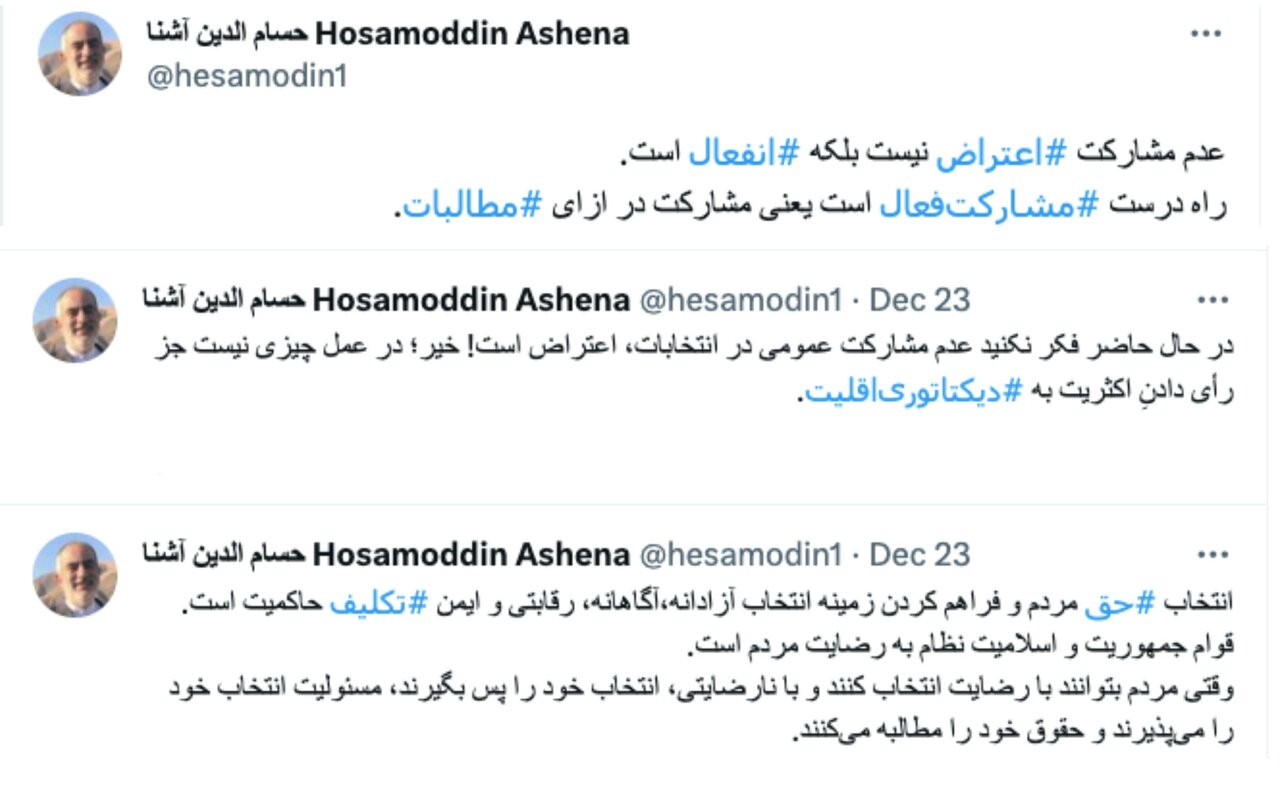به گزارش خبرگزاری خبرآنلاین، به دنبال اظهارات اخیر حسن روحانی رئیس جمهور دولت دوازدهم درباره مشارکت در انتخابات اسفند ۱۴۰۲، و فضاسازی تندروها علیه اظهارات وی، حسام الدین آشنا، مشاور روحانی در دولت پیشین در شبکه اجتماعی ایکس نوشت: