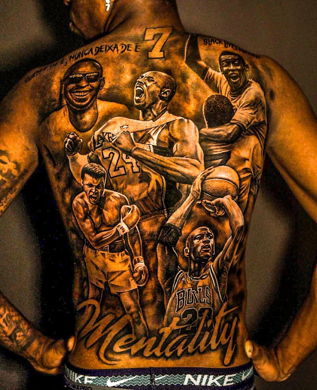 به گزارش خبرگزاری خبرآنلاین؛ وینیسیوس جونیور تتوی متفاوتی روی کمر خود زده که شامل تصاویری از اسطوره های ورزشی دنیا به همراه کلمه «Mentality» یا «ذهنیت» می شود. در این تتو تصویر پله، محمد علی کلی، کوبی برایانت، مایکل جردن و استیوی واندر مشاهده می شود.