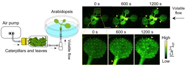اکنون، تیمی از محققان ژاپنی تکنیکهای تصویربرداری بلادرنگ را برای شناسایی نحوه دریافت و واکنش گیاهان به این هشدارها به کار گرفتهاند؛ در این آزمایشات دانشمندان ترکیبات ساطع شده از گیاهان آسیبدیده و آلوده به حشرات را بر روی همسایگان آسیبدیده آنها قرار دادند و یک میکروسکوپ فلورسانس برای تماشای آنچه اتفاق میافتد، ساختند.
