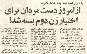 به گزارش خبرگزاری خبرآنلاین، روز سهشنبه ۱۵ بهمن ۱۳۵۳ روزنامهی اطلاعات در صفحهی نخست خود تیتر زد: «از امروز دست مردان برای اختیار زن دوم بسته شد!» ماجرا مربوط به لایحهی تازهی حمایت از خانواده بود که همان روز از تصویب مجلس گذشت و به قانون تبدیل شد. به موجب این قانون کلیهی اختلافات ناشی از امر زناشویی و دعاوی خانوادگی و سرپرستی اطفال صغیر از آن پس به دادگاه حمایت خانواده ارجاع میشد. همچنین به موجب مادهی ۱۶ آن دیگر هیچ مردی نمیتوانست با داشتن زن، همسر دوم اختیار کند مگر به ۹ شرط: ۱- رضایت همسر اول ۲- عدم قدرت همسر اول به ایفای وظایف زناشویی، ۳- عدم تمکین زن از شوهر، ۴- ابتلای زن به جنون یا امراض صعبالعلاج، ۵- محکومیت زن، ۶- ابتلای زن به هرگونه اعتیاد مضر ۷- ترک زندگی خانوادگی ۸- عقیم بودن زن ۹- غائب مفقودالاثر شدن زن.