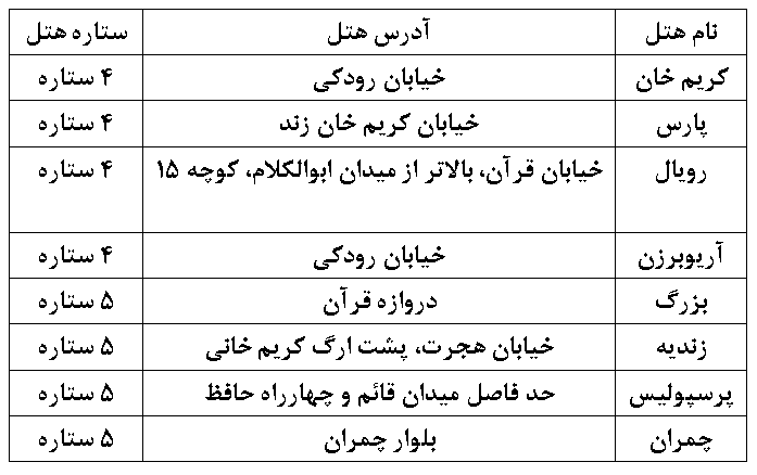 لیست هتل های 4 و 5 ستاره شیراز، مقایسه اتاق ها و طبقات آن