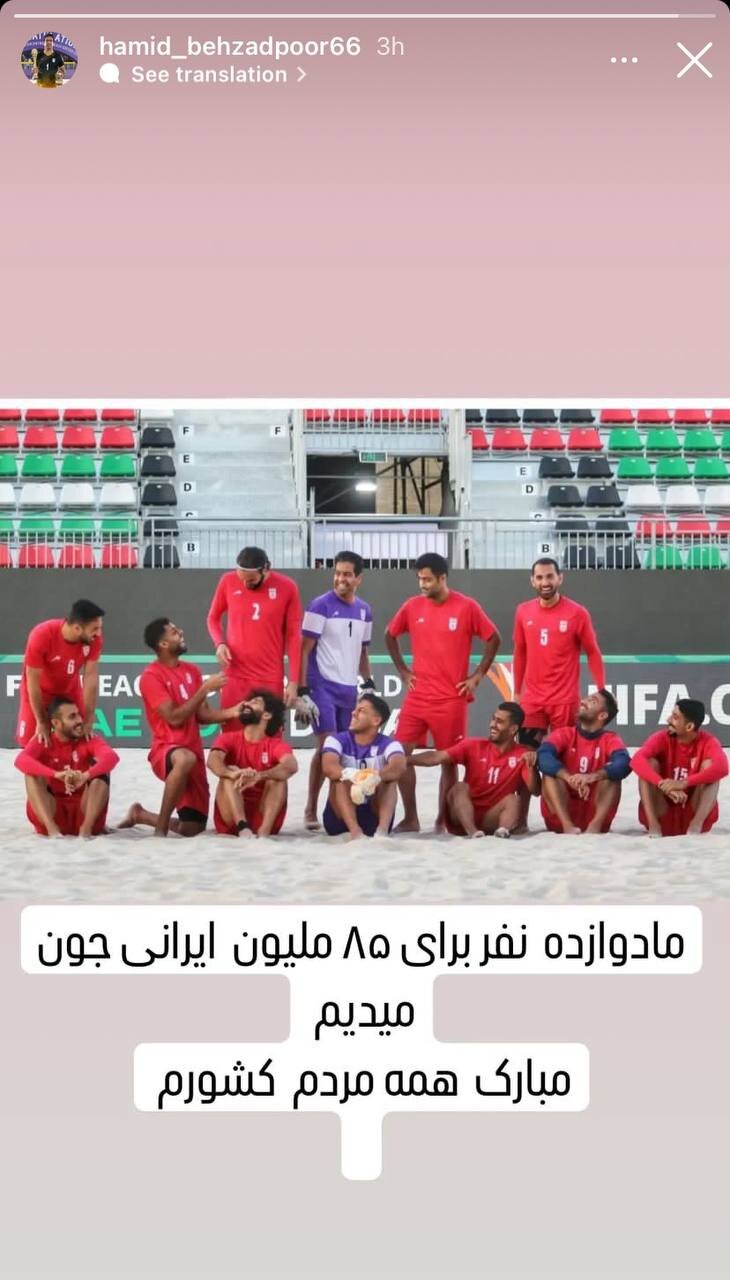 حمید بهزادپور، دروازهبان ایران پس از بازی با انتشار یک استوری نوشت: «ما 12 نفر برای 85 میلیون ایرانی جان میدهیم. مبارک همه مردم کشورم.»