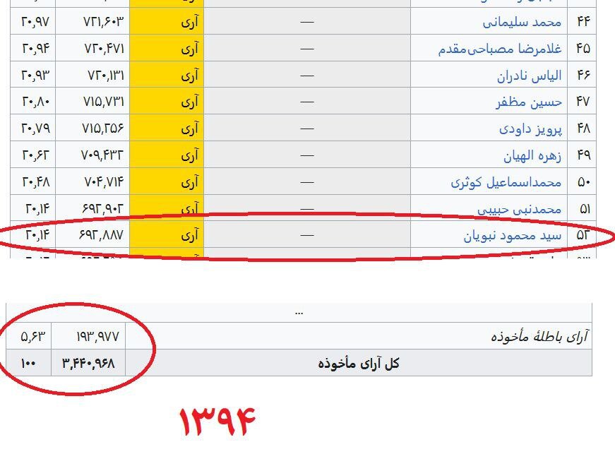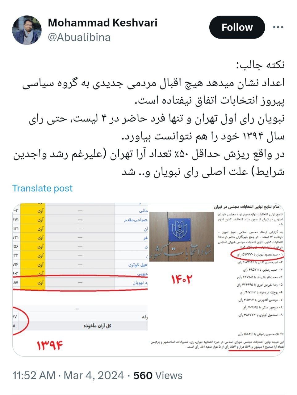 «نکته جالب: اعداد نشان میدهد هیچ اقبال مردمی جدیدی به گروه سیاسی پیروز انتخابات اتفاق نیفتاده است. نبویان رای اول تهران و تنها فرد حاضر در ۴ لیست، حتی رای سال ۱۳۹۴ خود را هم نتوانست بیاورد. در واقع ریزش حداقل ۵۰٪ تعداد آرا تهران (علیرغم رشد واجدین شرایط) علت اصلی رای نبویان و.. شد.»