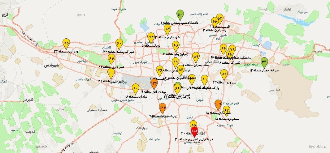 بر اساس جدول رنگبندی شرکت کنترل کیفیت هوا، ایستگاههای سبزرنگ شرایط "پاک"، زردرنگ شرایط "قابل قبول"، نارنجیرنگ شرایط "ناسالم برای گروههای حساس"، قرمزرنگ شرایط "ناسالم" و بنفشرنگ شرایط "بسیار ناسالم" را نشان میدهد.