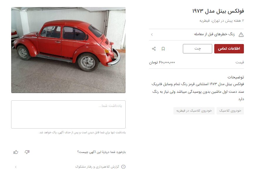 روزگار خودرو نوشت:فولکس قورباغهای هم قیمتش از نیم میلیارد تومان گذشته و تا بالای ۶۰۰ میلیون تومان در بازار آزاد فروخته میشود.