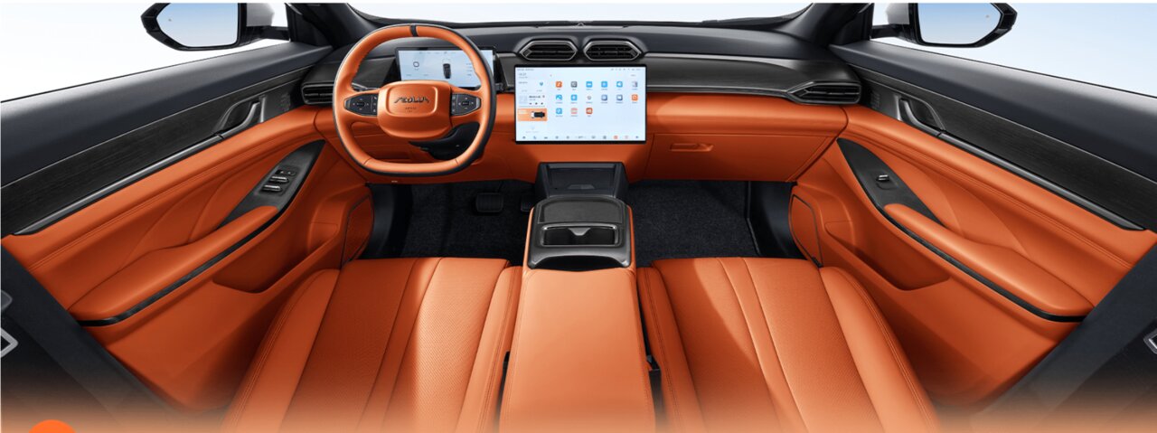 با ورود به کابین خودرو، با فضای نارنجی رنگ با حداقل تعداد دکمههای فیزیکی روبهرو خواهید شد. صفحه نمایش مرکزی شناور بزرگ و فرمان D کات بیشترین جلب توجه را در این بخش دارند. در بالای صفحه نمایش مرکزی دو خروجی تهویه مطبوع وجود دارد.