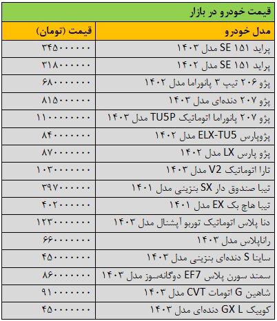 بنا به این گزارش، تارا اتوماتیک V۲ مدل ۱۴۰۳ در بازار ۱۰ میلیون تومان ارزان شد و یک میلیارد و ۳۰ میلیون تومان قیمت پیدا کرد. تارا دندهای V۱ هم با کاهش ۱۵ میلیون تومانی، ۸۵۰ میلیون تومان قیمت خورده است. همچنین تیبا صندوقدار SX بنزینی مدل ۱۴۰۱ در بازار ۳۹۷ میلیون تومان به فروش رفت. تیبا هاچبک EX مدل ۱۴۰۱ هم در بازار به قیمت ۴۰۲ میلیون تومان رسید.