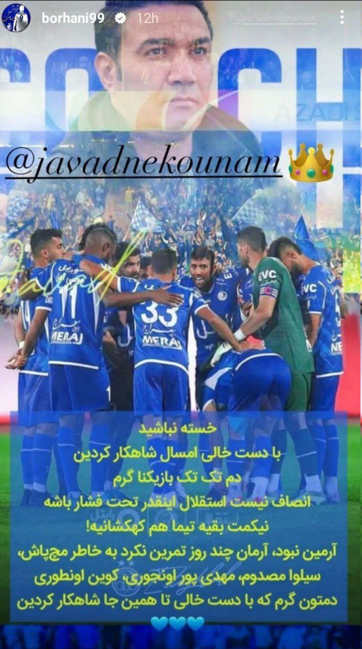 به گزارش خبرگزاری خبرآنلاین؛ آرش برهانی آقای گل سال های نه چندان دور استقلال پس از بازی این تیم مقابل تراکتور ک با نتیجه مساوی بدون گل به پایان رسید با انتشار استوری زیر به حمایت از جواد نکونام پرداخت.