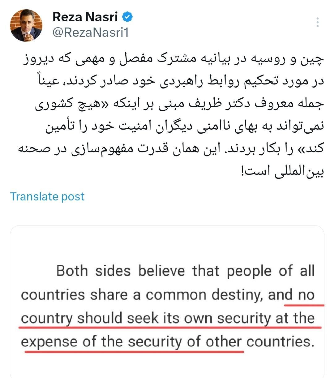چین و روسیه در بیانیه مشترک مفصل و مهمی که دیروز در مورد تحکیم روابط راهبردی خود صادر کردند، عیناً جمله معروف دکتر ظریف مبنی بر اینکه «هیچ کشوری نمیتواند به بهای ناامنی دیگران امنیت خود را تأمین کند» را بکار بردند. این همان قدرت مفهومسازی در صحنه بینالمللی است!
