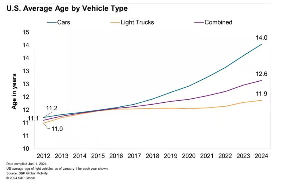 به گزارش خبرآنلاین، طبق گزارش S&P، خودروهای سواری به افزایش میانگین سنی کمک میکنند، بهطوریکه میانگین آنها ۱۴.۰ سال است (در مقایسه با ۱۱.۹ سال برای کامیونهای سبک). میانگین ترکیبی جدید نسبت به سال گذشته دو ماه افزایشیافته است و از زمان عبور از میانگین ۱۲ ساله در سال ۲۰۲۱ رشد ثابتی را نشان میدهد.