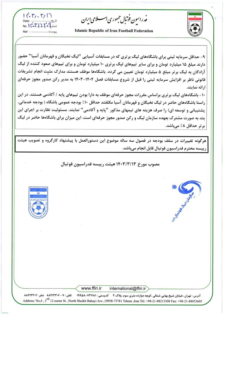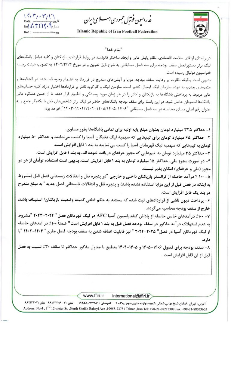 احتراما به پیوست دستورالعمل سقف بودجه سه فصل مسابقاتی (1404-1403، 1405-1404 و 1406-1405) باشگاههای حاضر در لیگ برتر فوتبال که در مورخ 13 خرداد به تصویب هیات رییسه فدراسیون فوتبال رسیده است، جهت دستور ابلاغ به مبادی ذیربط و اجرا دستورالعمل فوق الذکر حضورتان ایفاد می گردد.