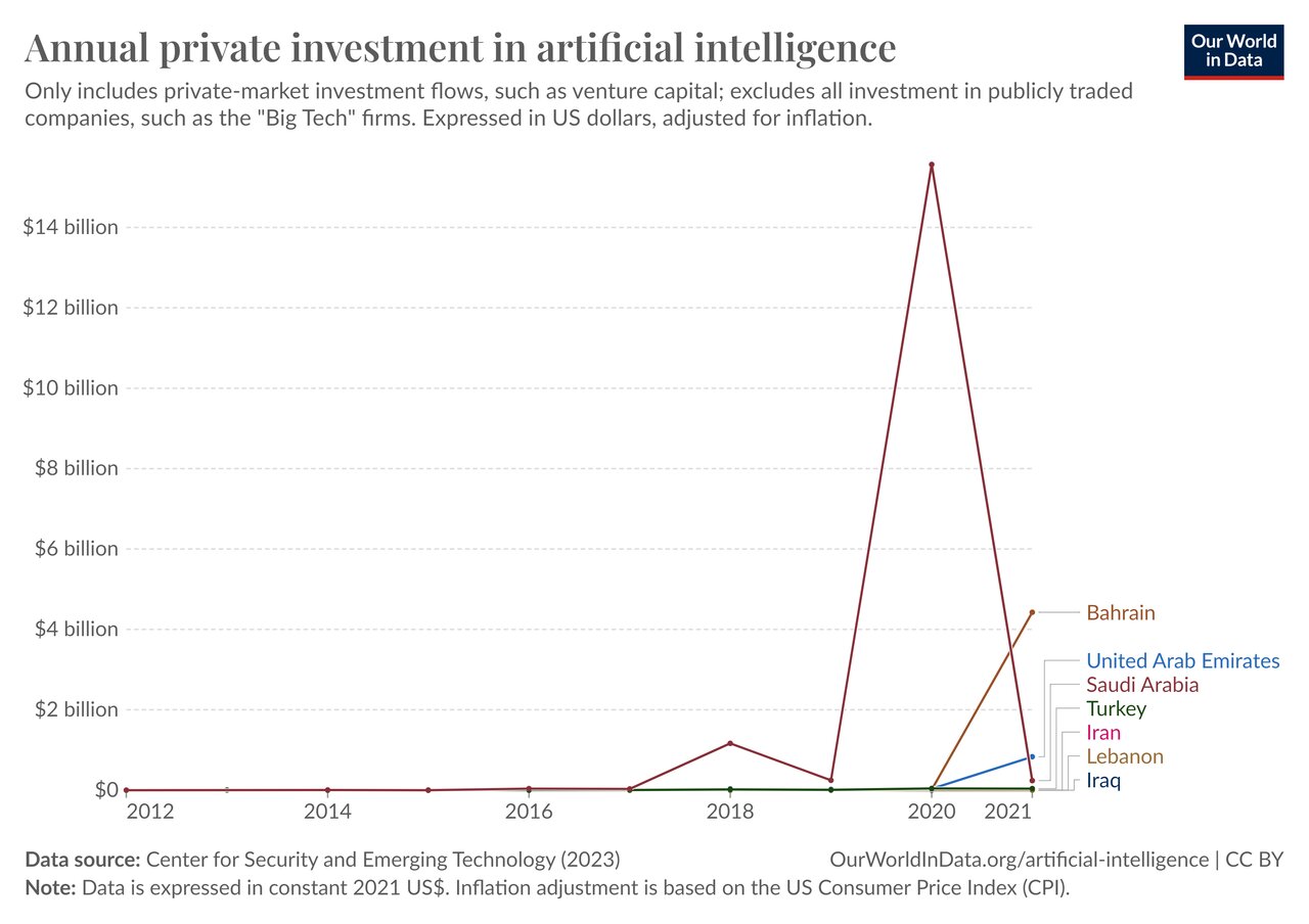 براساس دادههای OUR WORLD IN DATA، در میان کشورهای خاورمیانه، حجم سرمایهگذاری خصوصی هوش مصنوعی در بازه زمانی ۲۰۱۰ تا ۲۰۲۱ در ایران، لبنان و عراق ناچیز بوده است. در سال ۲۰۲۰ عربستان سعودی با سرمایهگذاری ۱۵٫۵۷ میلیارد دلاری توانست صدرنشین شود. سال ۲۰۲۱ بحرین با سرمایهگذاری ۴٫۴۳ میلیارد دلاری صدرنشین شد و پس از آن کشورهای امارات متحده عربی، عربستان سعودی و ترکیه قرار گرفتند.