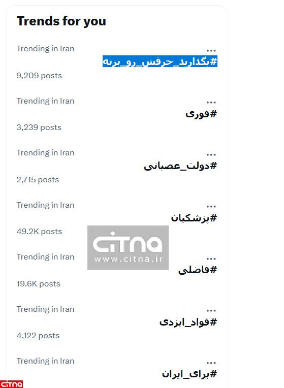 بنا به روایت سیتنا، در همین حال، طی ساعات اخیر هشتگ «بگذارید حرفش رو بزنه» ترند ایکس فارسی شد و تا کنون نزدیک به ۱۰ هزار پست با این هشتگ منتشر شده است.