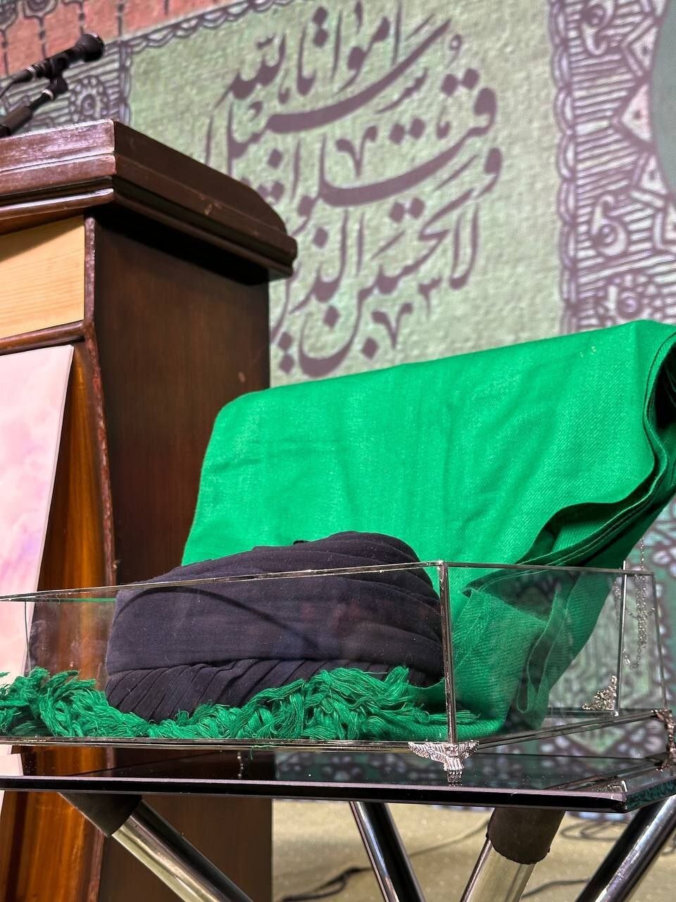 تصویری از شال و عمامه شهید رئیسی در کنار تصویر شهدای خدمت در مصلی تهران را مشاهده می کنید.