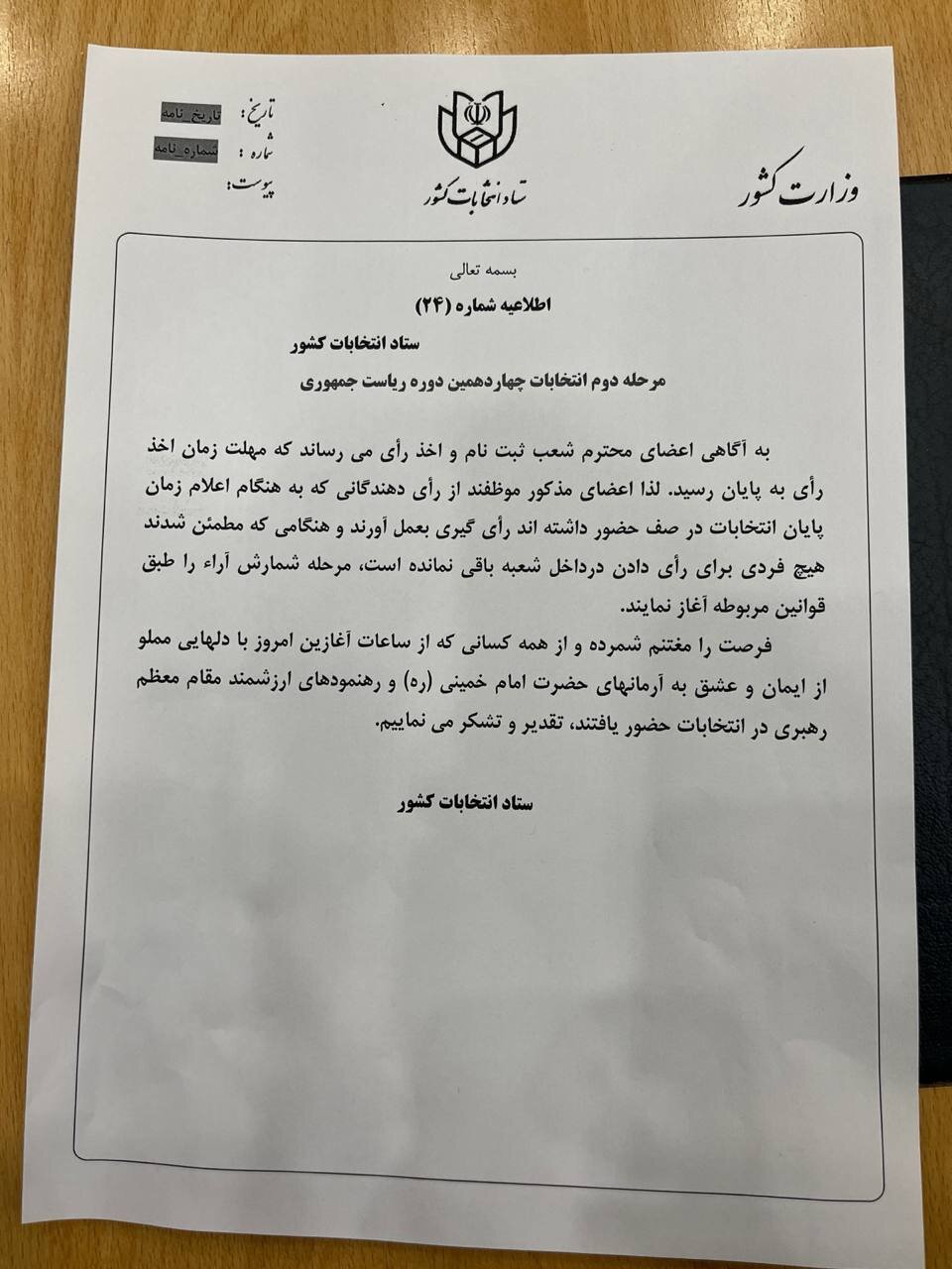 به آگاهی اعضای محترم شعب ثبت نام و اخذ رای می رساند که مهلت زمان اخذ رای به پایان رسید. لذا اعضای مذکور موظفند از رای دهندگانی که به هنگام اعلام زمان پایان انتخابات در صف حضور داشته اند رای گیری بعمل آورند و هنگامی که مطمئن شدند هیچ فردی برای رای دادن در داخل شعبه باقی نمانده است، مرحله شمارش آراء را طبق قوانین مربوطه آغاز نمایند.