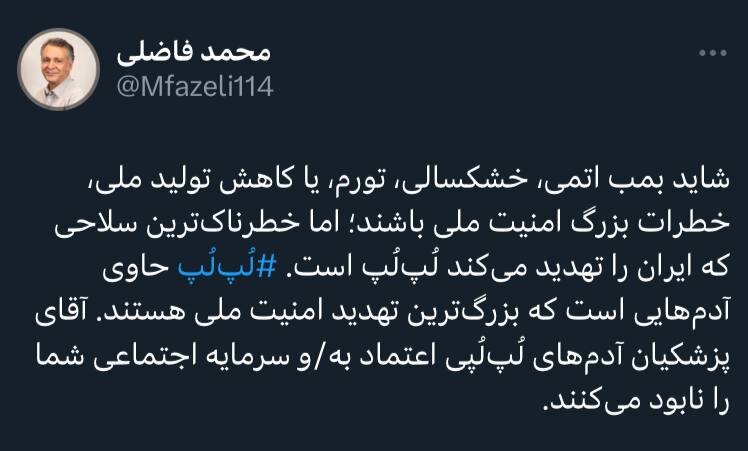 شاید بمب اتمی، خشکسالی، تورم، یا کاهش تولید ملی، خطرات بزرگ امنیتی باشند؛ اما خطرناکترین سلاحی که ایران را تهدید میکند لُپلُپ است.