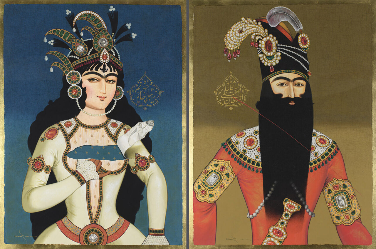 در همین دسته اثر آیدین آغداشلو هم تعریف می‌شود، دو تابلو در یک نقاشی با نام «پایان یک دوره از مجموعه خاطرات انهدام» در این اثر که با تکنیک گواش روی کاغذ خلق شده یک طرف فتحعلی‌شاه قاجار است که تمام اسلوب‌های نقاشی قجری بر روی آن رعایت شده و هنرمند فقط یک حرکت انجام داده خطی بسیار نازک با قلم‌مو و با رنگ قرمز روی شخصیت کشیده است؛ در تابلوی کناری با عنوان «چهره زیبا خانم» هم تمام تکنیک‌های نقاشی دوره قاجار رعایت شده است با یک اختلاف که هنرمند بخشی از کاغذ روی نقاشی را بریده و انگار شکاف یا برشی را در قلب سنت ایجاد کرده که زیر آن همان الگو با رنگ دیگری تکرار شده است. اینجا بیننده است که می‌تواند هر تأویلی داشته و آنچه از اسرار نهفته در سینه زیبا خانم هست را روایت کند.