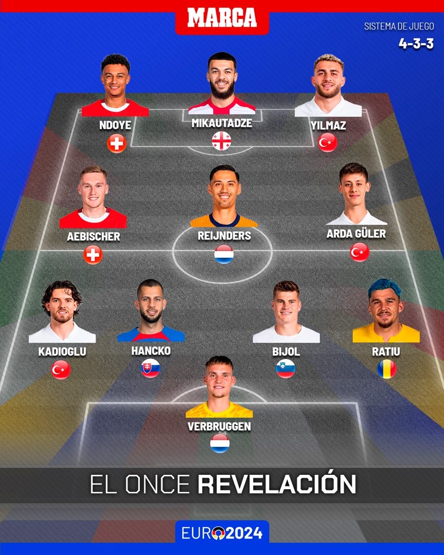 دروازهبان: فربروخن (هلند)مدافعان: راتیو (رومانی) – بیول (اسلوونی) – هانکو (اسلوواکی) – کادیوگلو (ترکیه)هافبک: ریندرز (هلند) – آردا گولر (ترکیه) – آبیشیر (سوئیس)مهاجمان: اندویه (سوئیس) – ییلماز (ترکیه) – میکاتادزه (گرجستان)