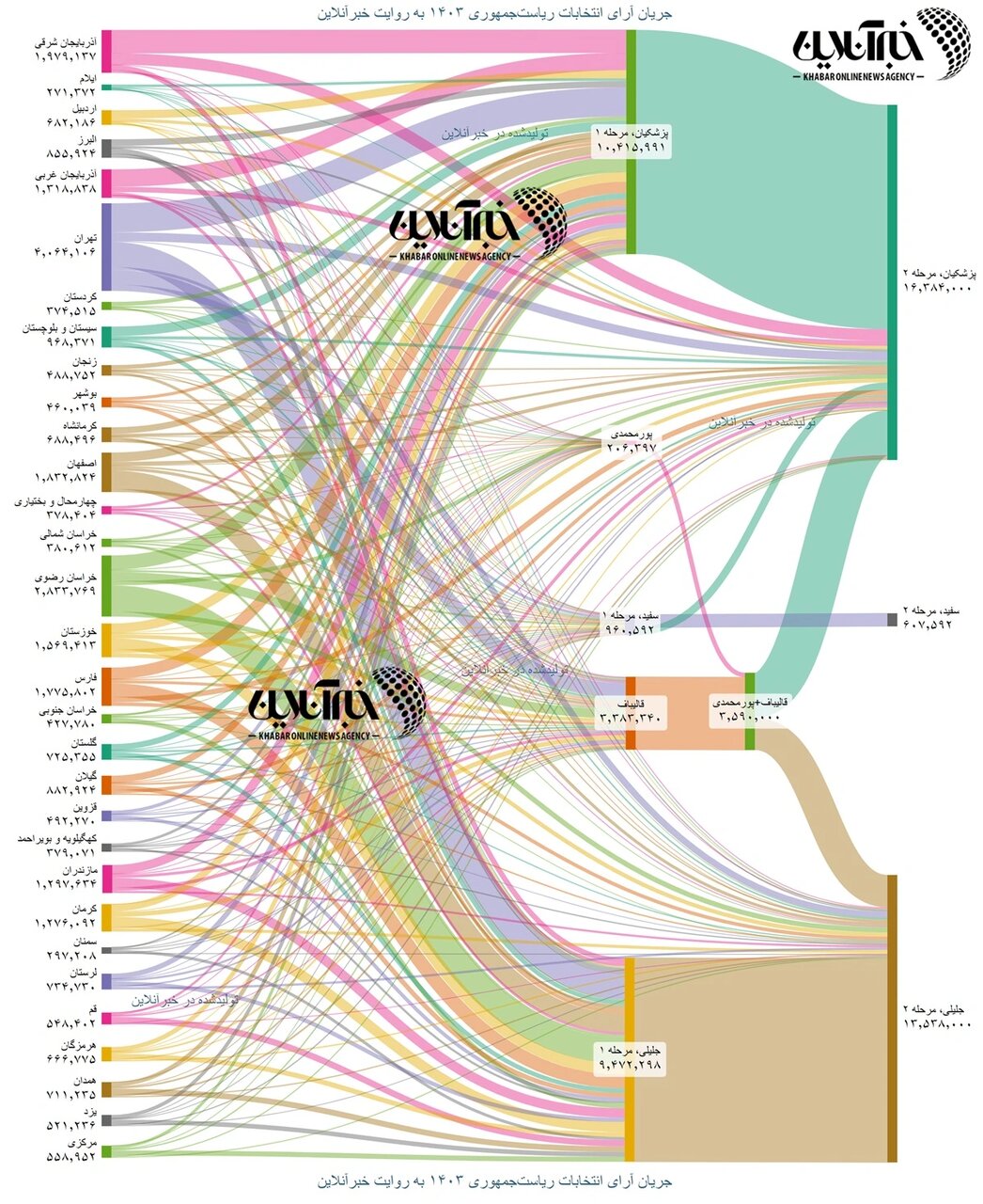 روند جذب آراء را در چهاردهمین انتخابات ریاستجمهوری ۱۴۰۳ میتوان بر اساس نمودار زیر (نمودار ۶) روایت کرد. این نمودار که به «سانکی» معروف است، بیشتر در بررسیهای مالی و جریان پول مورداستفاده قرار میگیرد، اما روند آراء را نیز به شکل زیبایی نمایش میدهد.