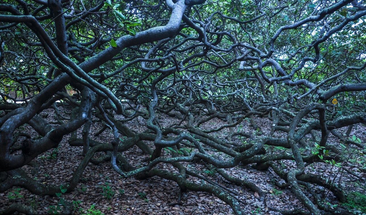 شاخههای این درخت بهطور غیرمعمول بهجای بالا در جهت اطراف رشد کردهاند. وزن درخت و جاذبه زمین هم شاخهها را به سمت زمین خم کرده و آنها را به درون خاک کشانده است. سپس از همانجا ریشههای جدیدی شکل گرفتهاند. در حال حاضر این روند رشد این درخت هنوز ادامه دارد و نمیتوان تنه اصلی و اولیه این درخت را تشخیص داد.