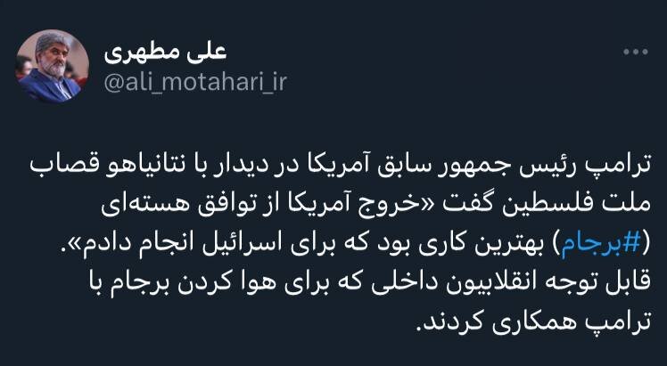 به گزارش خبرگزاری خبرآنلاین، علی مطهری، نماینده تهران در مجلس دهم، در شبکه اجتماعی ایکس نوشت: «ترامپ رئیس جمهور سابق آمریکا در دیدار با نتانیاهو قصاب ملت فلسطین گفت «خروج آمریکا از توافق هستهای (برجام) بهترین کاری بود که برای اسرائیل انجام دادم». قابل توجه انقلابیون داخلی که برای هوا کردن برجام با ترامپ همکاری کردند.»