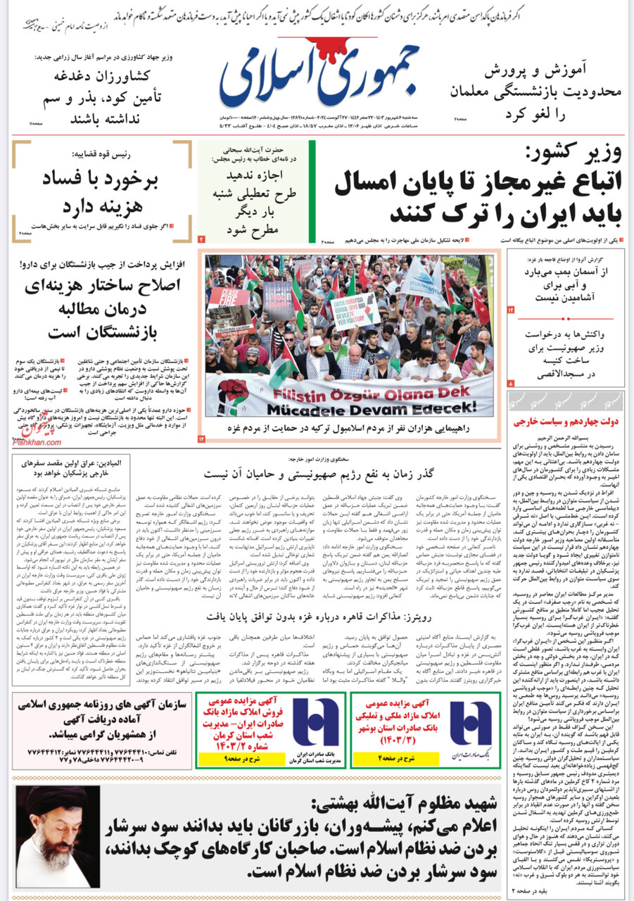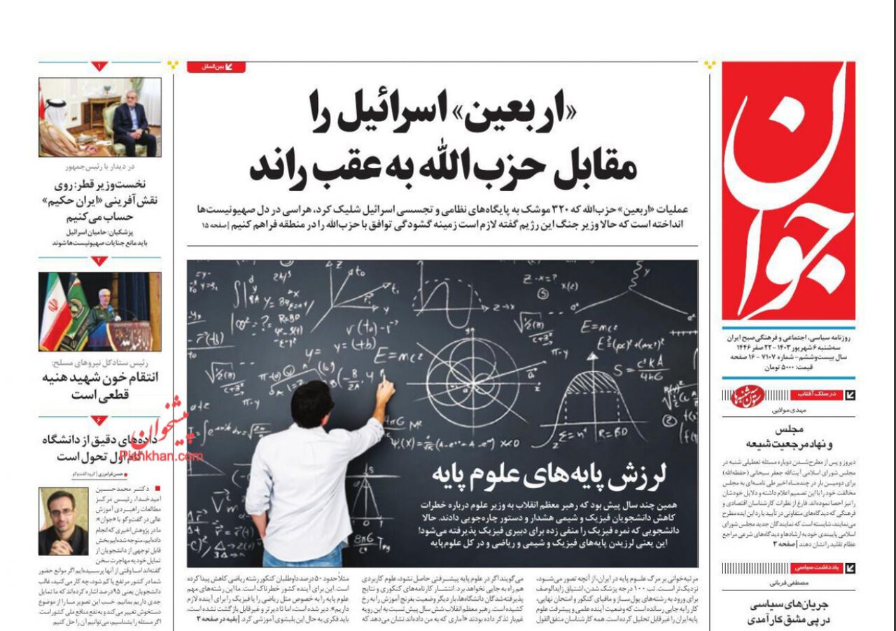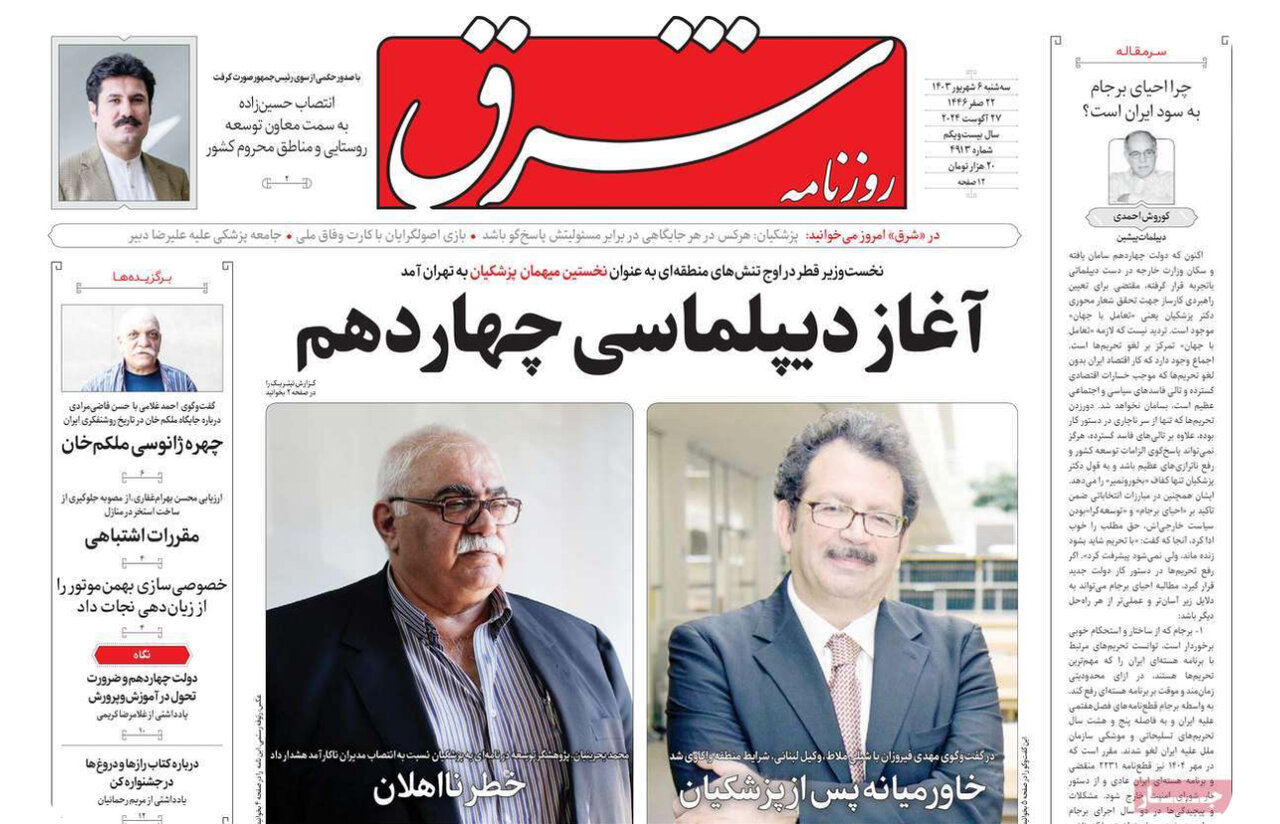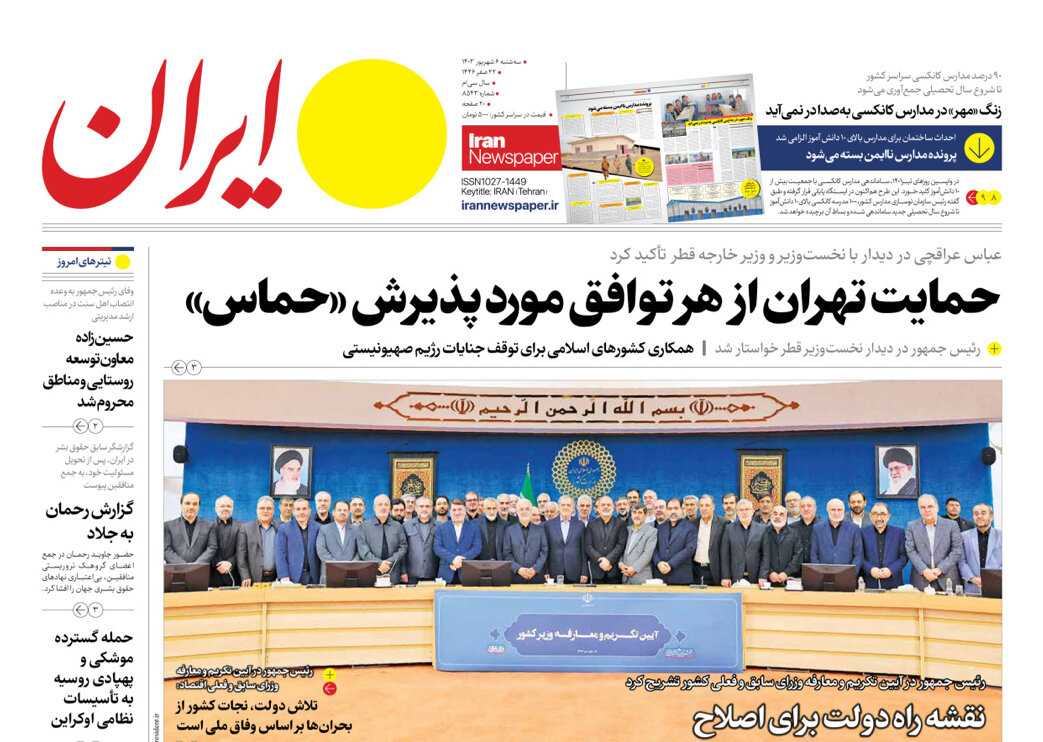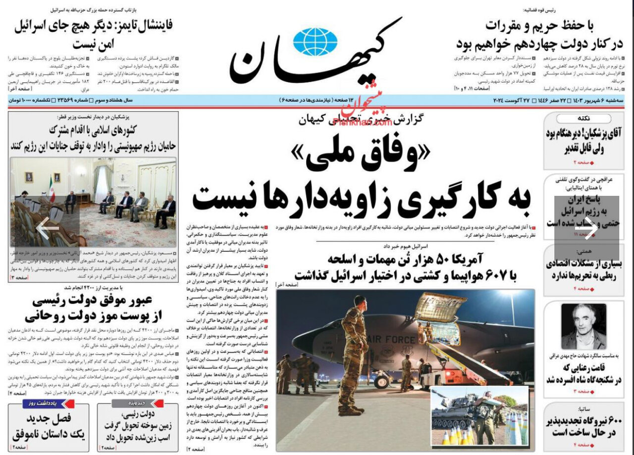 پیشخوان نشریات ششم شهریورماه ۱۴۰۳ اخبار چندان تاپی ندارد نه خبری از یک رویداد عجیب است نه یک رخداد ویژه . کیهان به انتصابها پیله کرده. همشهری و جام جم از سانسور صهیونیستها تیتر ساختند. چند رسانه تصویری از مهمان عراقچی در تهران را جلد کردند و حمایت ایران از حماس و خراسان به رییسجمهور پیشنهاد داده سفرهای استانی اش را از مشهد مقدس آغاز کند.