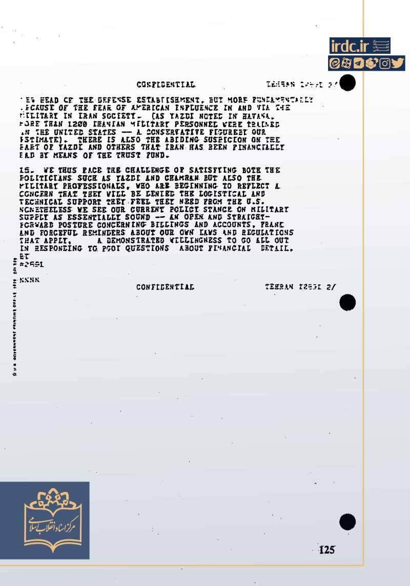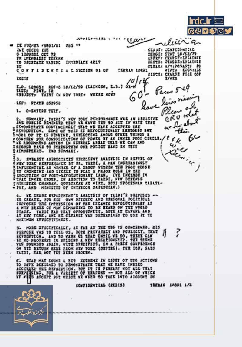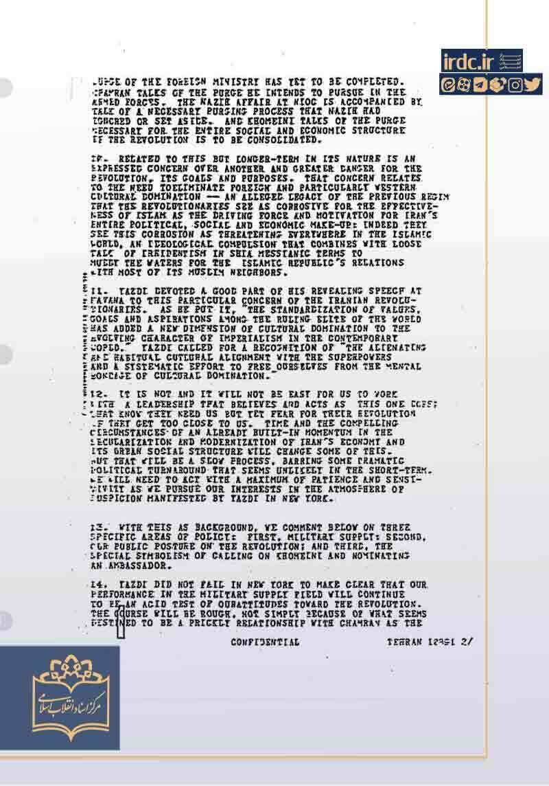 بنابرآنچه پایگاه اطلاعرسانی مرکز اسناد انقلاب اسلامی، روایت میکند، در میان آن چهرهها ابراهیم یزدی، وزیر امور خارجهی آینده، که از نظر لینگن شکلدهنده و مدیر حلقهی سیاسی اطراف آیت الله خمینی محسوب میشد، موضوع اصلی این تلگراف است. سفارت برای ماهها تلاش میکرد تا صحنهی آشفتهی سیاسی تهران را درک کند و کانالی برای رسیدن به مقامات عالی رتبه انقلابیون بیابد. اما پس از تلاشهای بسیار، فقط توانستند به مقامات معتدل و غرب گراتر در میان انقلابیون دست پیدا کنند، نه گروهی که ایت الله خمینی را احاطه کرده بودند.