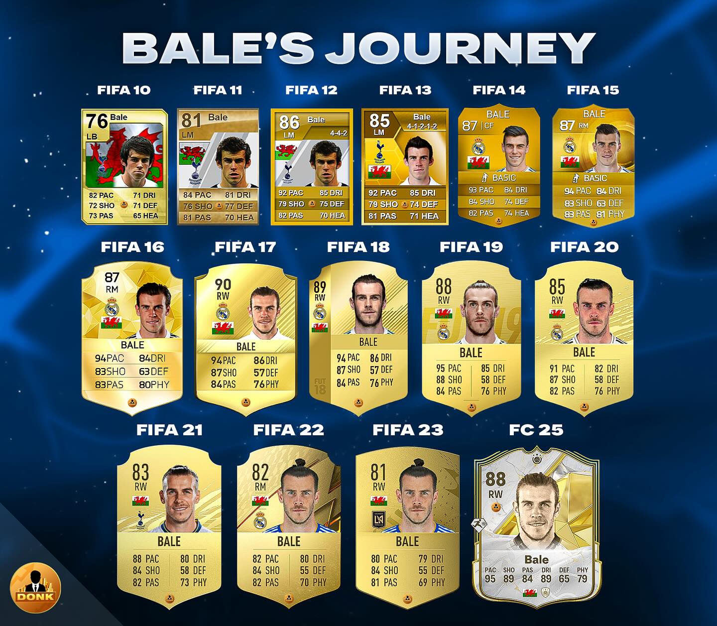 در اینجا میتوانید تمام کارتهایی که این بازیکن ولزی در بازی FIFA دریافت کرد را ببینید. به راحتی میتوان دید که این بازیکن حتی در بدترین فصلهای خود نیز دارای سرعتی بسیار بالا بوده و اکنون در بازی FC 25 نیز یکی از سریع ترین بازیکنان است.
