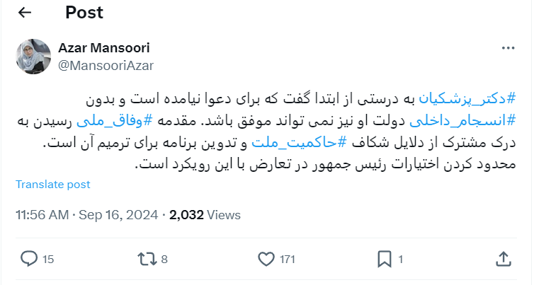 به گزارش خبرگزاری خبرآنلاین، آذر منصوری، رئیس جبهه اصلاحات ایران، با انتشار یادداشتی در شبکه اجتماعی ایکس نوشت: