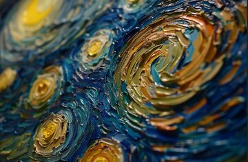 در نقاشی شب پرستاره ونسان ونگوگ، آسمان آبی در حال چرخش را با ماه و ستارههای زرد مشاهده میکنیم. آسمان در ظاهر انفجاری از رنگها و اشکال است که هر یک از ستارهها در بین موجهای زرد محصور شدهاند و با نوری شبیه به انعکاس روی آب میدرخشند.