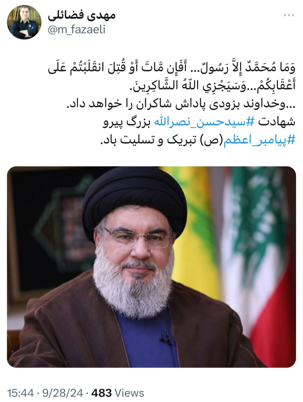 به گزارش خبرگزاری خبرآنلاین، مهدی فضائلی، عضو دفتر نشر آثار مقام معظم رهبری، محسن رضایی، عضو مجمع تشخیص مصلحت نظام و سعید محمد، فرمانده قرارگاه خاتم الانبیاء در واکنش به شهادت سید حسن نصرالله، دبیرکل حزبالله در شبکه اجتماعی ایکس پستی منتشر کردند.