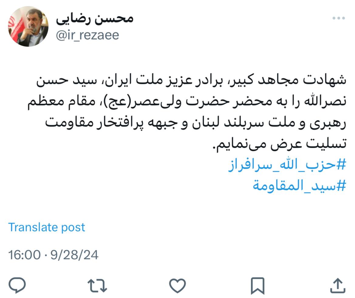 محسن رضایی هم ضمن تسلیت شهادت دبیرکل حزبالله لبنان در صفحه شخصی خود آورده است: