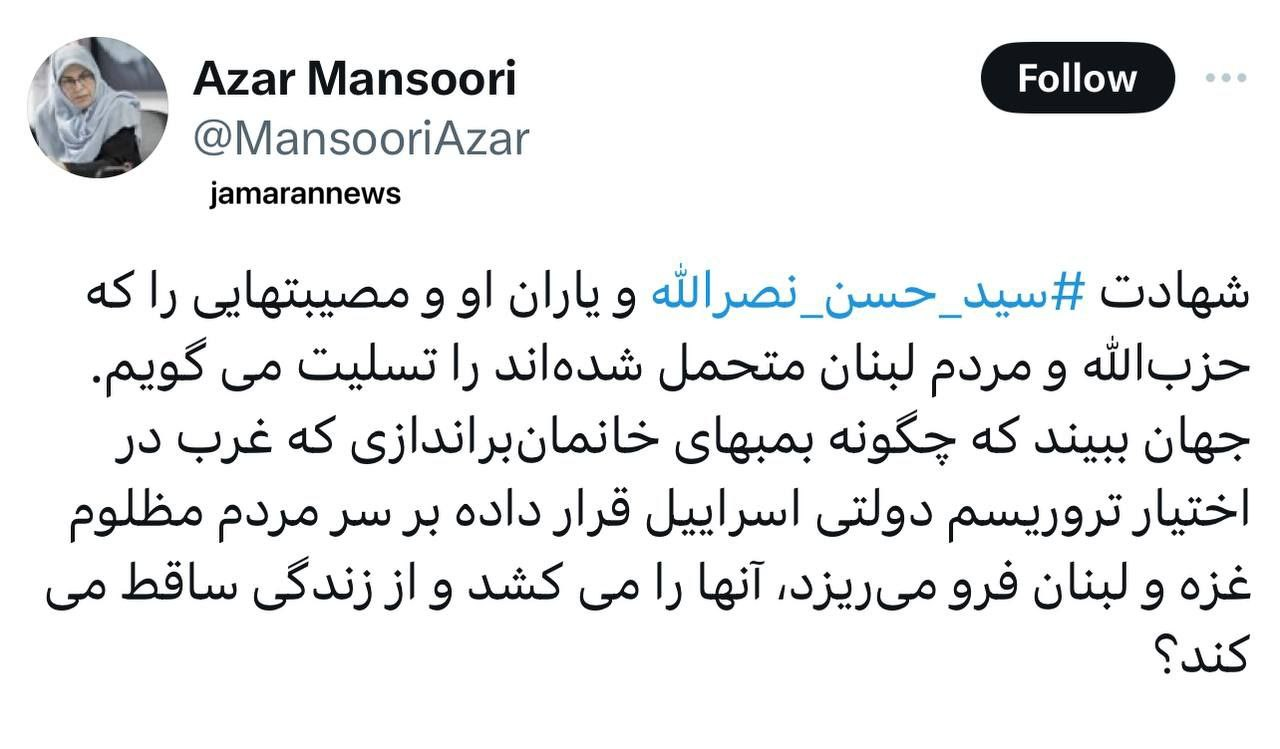 همچنین آذر منصوری، رئیس جبهه اصلاحات ایران، با انتشار یادداشتی در شبکه اجتماعی ایکس، نوشت: