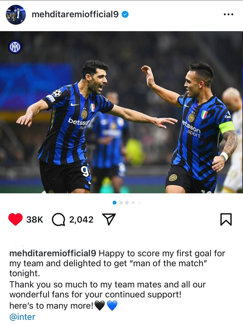 به گزارش خبرگزاری خبرآنلاین؛ در شبی بهیادماندنی، مهدی طارمی، ستاره تیم ملی فوتبال ایران و باشگاه اینتر، اولین گل خود را برای تیمش به ثمر رساند و با عملکردی درخشان عنوان بهترین بازیکن زمین را از آن خود کرد.