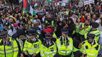 سیل عظیم شرکتکنندگان در این حرکت اعتراضی که در آستانه نخستین سالگرد جنگ علیه غزه برگزار شد، با سردادن فریادهای ضد اسرائیلی خواستار توقف جنگ و برقراری فوری آتشبس در غزه و لبنان شدند. منبع: خبرفوری
