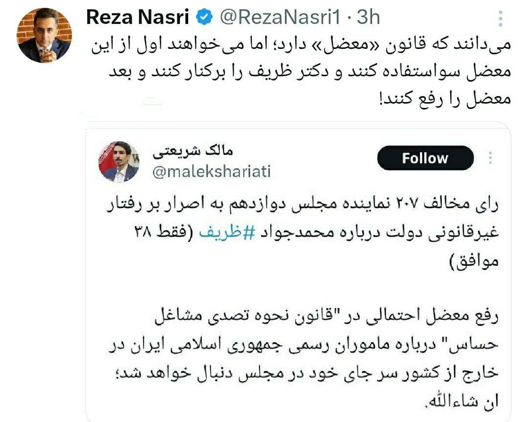 میدانند که قانون «معضل» دارد؛ اما میخواهند اول از این معضل سو استفاده کنند و دکتر ظریف را برکنار کنند و بعد معضل را رفع کنند!