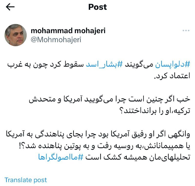 دلواپسان می گویند بشار اسد سقوط کرد چون به غرب اعتماد کرد. خب اگر چنین است چرا می گویید امریکا و متحدش ترکیه او را برانداختند؟