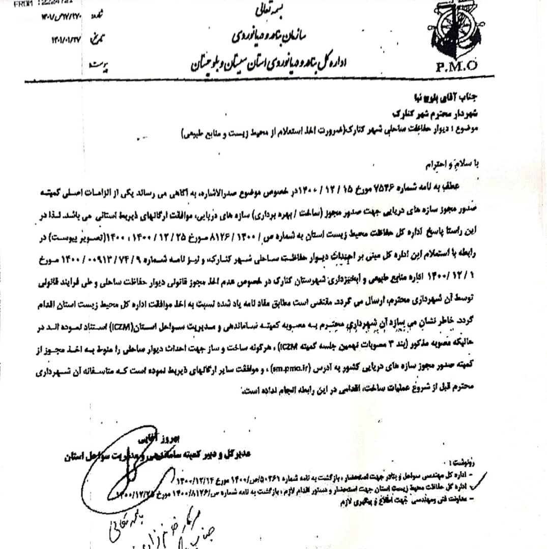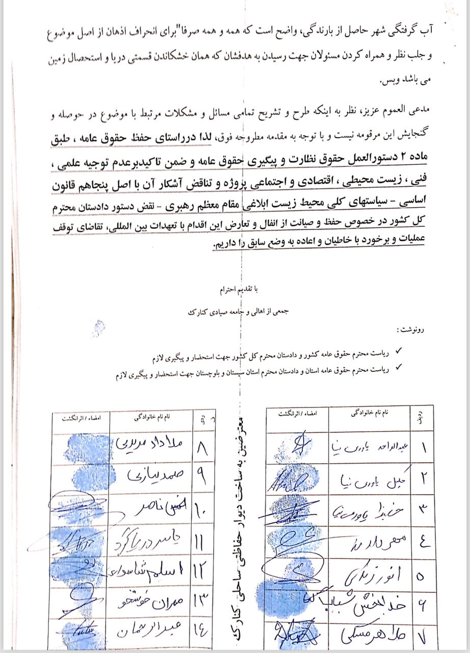 الهه جعفرزاده: از حدود سه سال پیش، شهرداری کُنارَک اقدام به سنگریزی و خاکریزی در حریم ۶۰ متری دریای عمان در منطقه کنارک و استحصال اراضی ساحلی کرد و ساخت یک دیواره ساحلی به طول ۳ هزار متر و عرض حدود ۸۰ متر در ساحل شهر بندری کنارک در استان سیستان و بلوچستان را در دستور کار خود قرار داد.