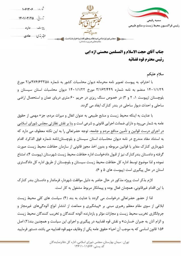محمدی عنوان میکند: «یکی از علل تجری در تخلفات، برخورد ضعیف و کوتاهی قوه قضاییه است. مدیرکل محیطزیست استان سیستان و بلوچستان یک بار حرف خوبی زد؛ گفت ما آمدیم به دستگاه قضایی شکایت کردیم، به اداره بنادر گفتیم ما نمیتوانیم جلوی شهرداری را بگیریم، دستگاه قضا باید این کار را بکند. ما اعلام کردیم که آنها برای ساختن دیوار ساحلی مجوز محیطزیست ندارند و این کار خلاف است ولی خودمان که نمیتوانیم جلوی آن را بگیریم. این حرف منطقی و درست است. یعنی دستگاههای دیگر، در رأس آنها قوه قضاییه، باید با شدت و قاطعیت با خلافهای محیطزیستی برخورد کنند ولی متأسفانه گویا در دستگاه قضایی تجاوز به طبیعت و داراییهای عمومی را خیلی مشکل جدی و بزرگی نمیدانند و با کسانی که در این زمینه خلاف میکنند خیلی مدارا میشود. اگر برخورد قاطعی صورت گیرد، این سازه بهکلی تخریب شود و مقاماتی که خلاف کردهاند زندان بروند و مجازات حقیقی برای آنها اعمال شود، این قبیل کارها دیگر تکرار نمیشود.