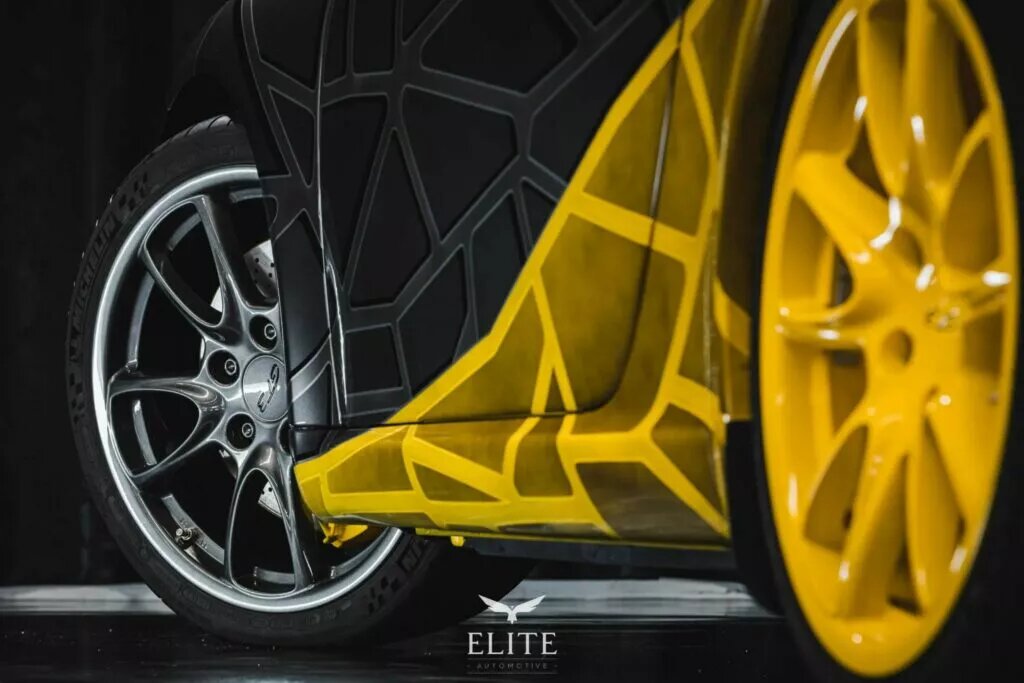 پاسخ این سوال به بدنه بیرونی باز میگردد؛ جایی که «ریچارد اورلینسکی»، مجسمهساز فرانسوی و هنرمند نئوپاپ، هنر خود را نشان داده است. او با صرف ۵۰۰ ساعت زمان روی طرح بدنه متمایز این 911GT3، بیش از ۱۰ لایه رنگ خاکستری و ۱۱ لایه رنگ زرد کار کرده است. الگوهای طرح بدنه بر پایه طرحهای پیشین این هنرمند اروپایی انجام شده و امضای شخصی او نیز در بخش عقب خودرو نقش بسته است.