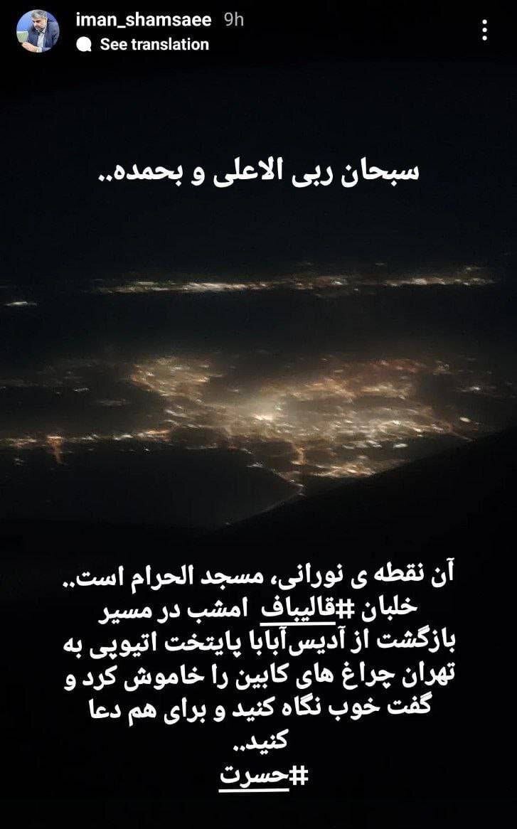 به گزارش خبرگزاری خبرآنلاین، ایمان شمسایی رئیس مرکز ارتباطات، رسانه و امور فرهنگی مجلس در فضای مجازی خبر داد که محمدباقر قالیباف رییس مجلس شورای اسلامی، خلبان پرواز بازگشت از اتیوپی به ایران شد.