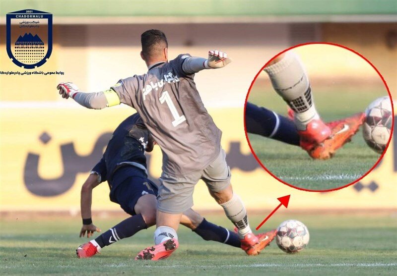 در این صحنه به صورت واضح، پیام نیازمند دروازهبان سپاهان در محوطه هجده قدم با کف پا روی مچ پای رضا محمودآبادی میرود و اگر VAR وجود داشت هم دروازهبان تیم اصفهان اخراج میشد و هم نتیجه دیگری رقم میخورد تا مهاجم این تیم فرصت توهین به هواداران حاضر در ورزشگاه را در آخر بازی نداشته باشد!