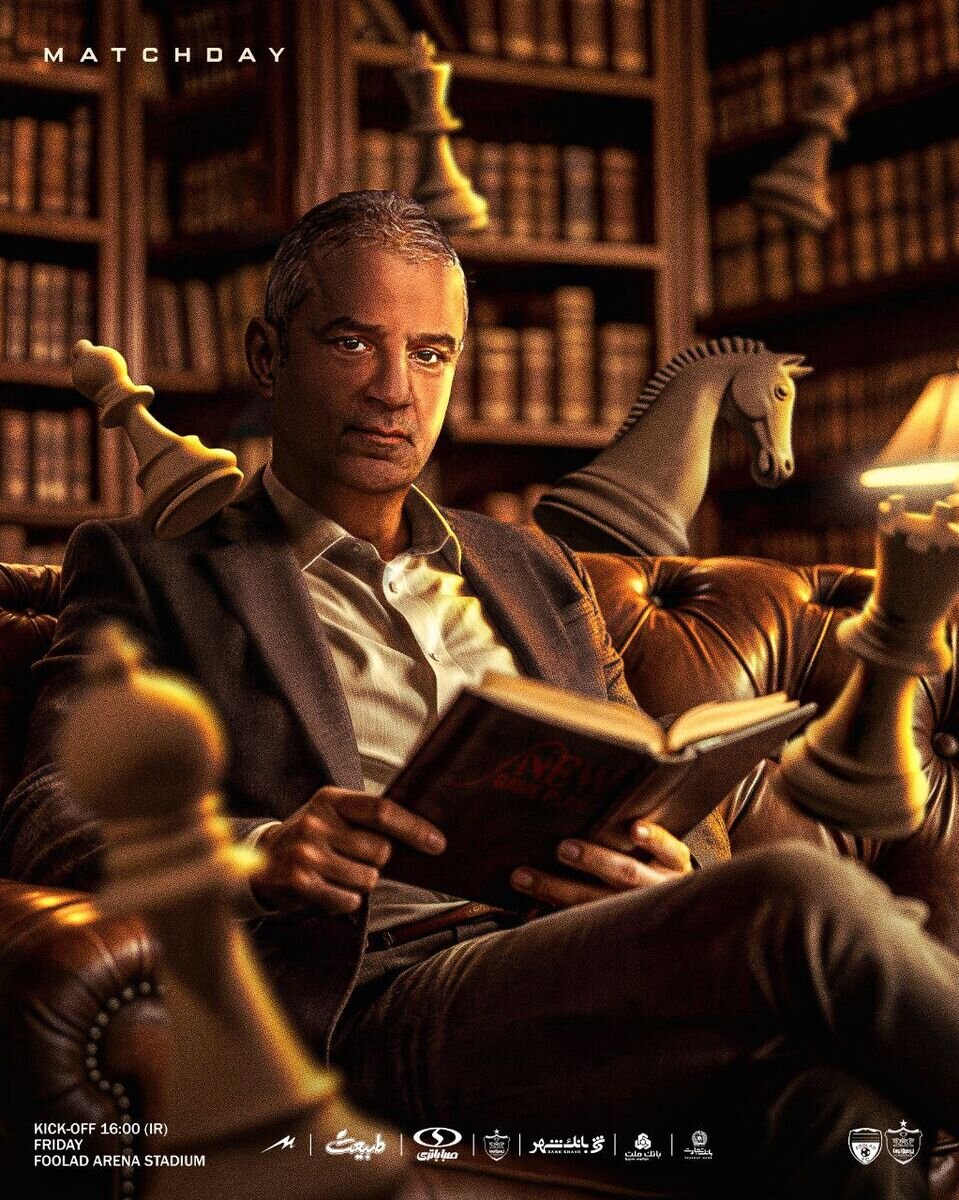 در این پوستر تصویری از اسماعیل کارتال سرمربی پرسپولیس نشان داده شده است که مهرههای شطرنج در اطراف او در حال پرواز هستند.