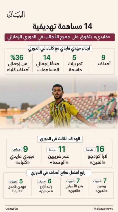 البیان نوشته است: مهدی قایدی، ستاره ایرانی تیم کلباء، ۹ گل از مجموع ۲۵ گل تیمش در لیگ ادنوک حرفهای این فصل را به ثمر رسانده و همچنین در ساخت ۵ گل دیگر نقش داشته است. قایدی در جدول گلزنان لیگ، با ۹ گل در رتبه سوم قرار دارد و پس از لابا کودجو، مهاجم العین با ۱۶ گل، و عمر خریبین، بازیکن الوحده با ۱۱ گل، ایستاده است.