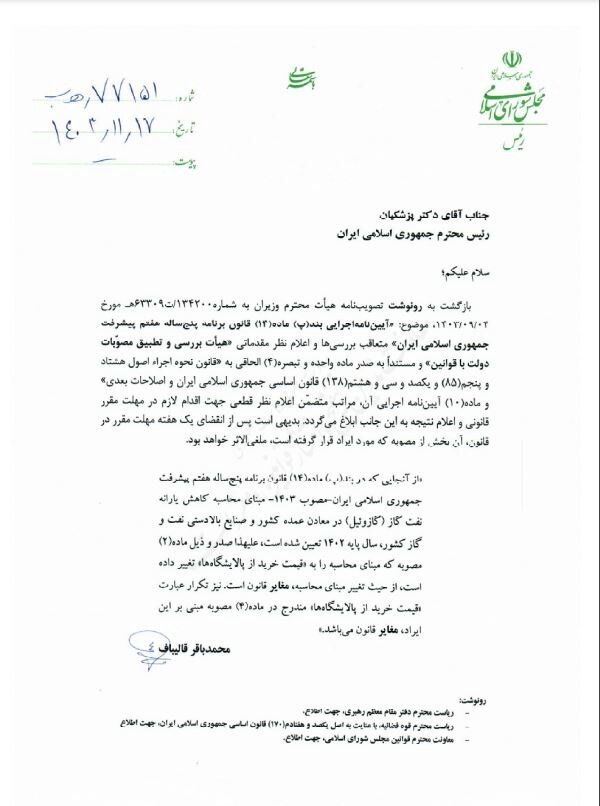 بنا بر روایت فارس، بر اساس نظر رئیس مجلس، از آنجایی که در بند پ ماده ۱۴ قانون برنامه هفتم پیشرفت مبنای محاسبه کاهش یارانه نفت گاز (گازوئیل) در معادن عمده کشور و صنایع بالادستی نفت و گاز کشور، پایه سال ۱۴۰۲ تعیین شده است؛ علیهذا صدر و ذیل ماده ۲ مصوبه که مبنای محاسبه را به قیمت خرید از پالایشگاه تغییر داده، از حیث تغییر مبنای محاسبه مغایر با قانون است.
