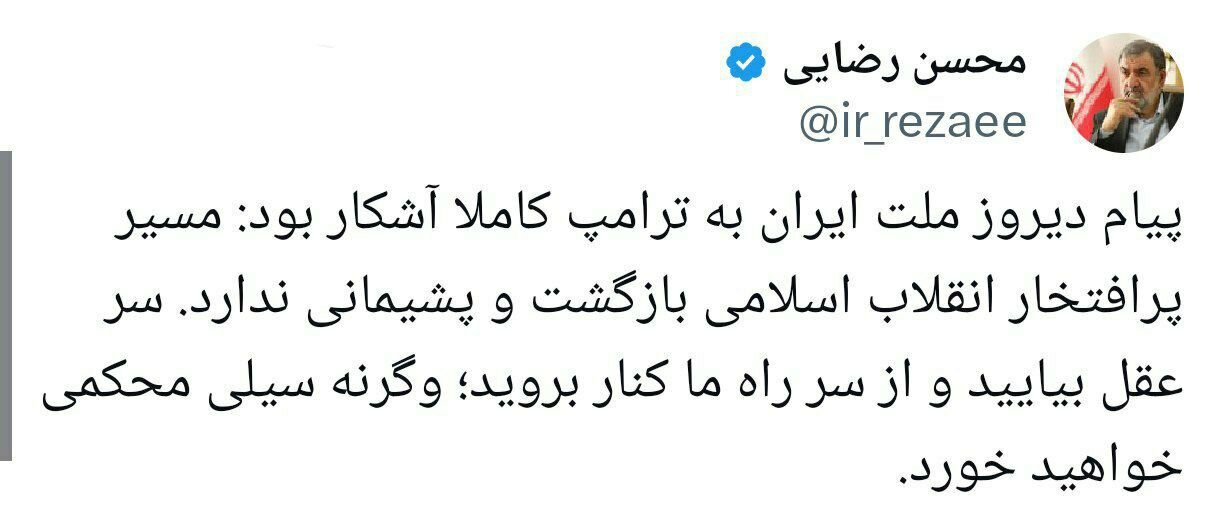 به گزارش خبرگزاری خبرآنلاین، محسن رضایی، عضو مجمع تشخیص مصلحت نظام، در شبکه اجتماعی ایکس خطاب به دونالد ترامپ، رئیس جمهور آمریکا نوشت: پیام دیروز ملت ایران به ترامپ کاملا آشکار بود: مسیر پر افتخار انقلاب اسلامی بازگشت و پشیمانی ندارد. سر عقل بیایید و از سر راه ما کنار بروید؛ و گرنه سیلی محکمی خواهید خورد.