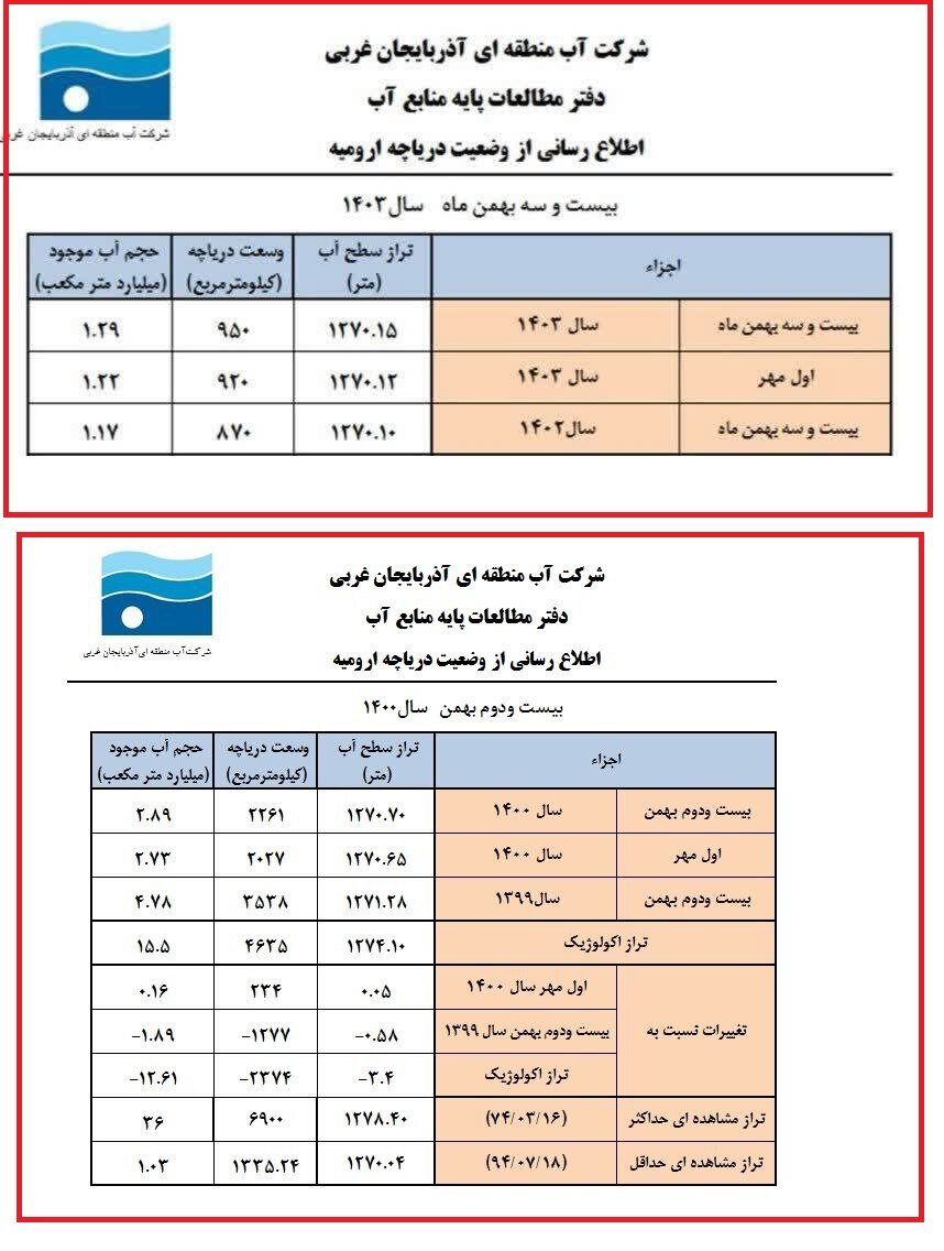 همچنین وسعت دریاچه ارومیه به ۹۵۰ کیلومتر مربع رسیده که نسبت به ابتدای بهمنماه کمی بهبود یافته و هم اکنون نگین آبی آذربایجانغربی تنها ۱.۲۹ میلیارد مترمکعب آب دارد.